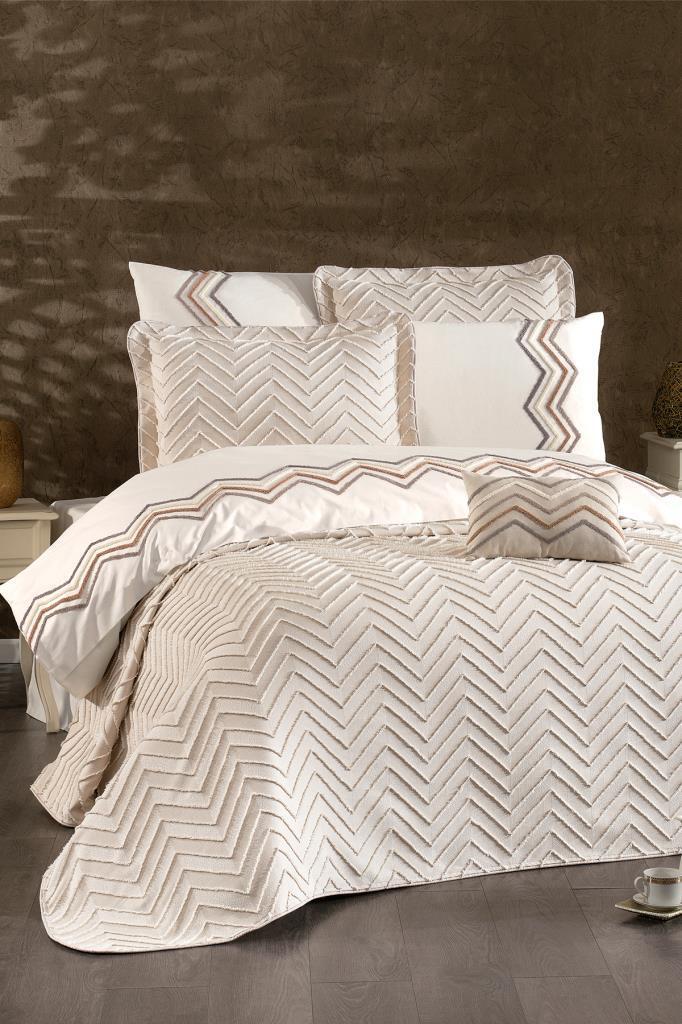 Nevresim takımı Akfil kumaştan üretilmiştir. Pike ve Pike kırlent kılıfları Şönil Kumaştan üretilmiştir.