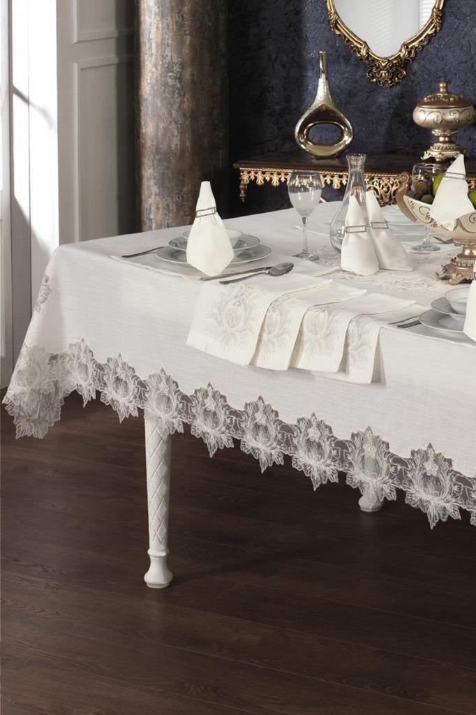 Fransız dantelleri masa örtüsü 4 kenarında uygulanarak şık bir tasarım oluşturulmuştur.