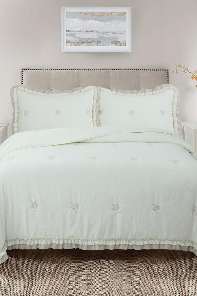 Bigo Nakışlı Fırfırlı Çift Kişilik Yatak Örtüsü Krem