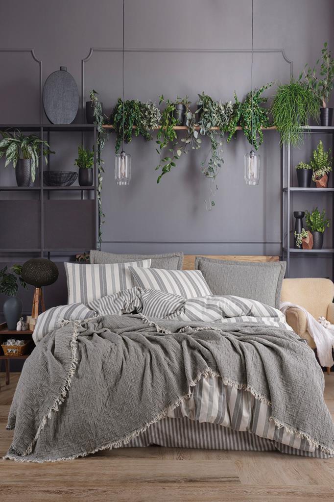 Bona 7 Parça %100 Pamuk Çift Kişilik Yatak Örtülü Nevresim Takımı Gri