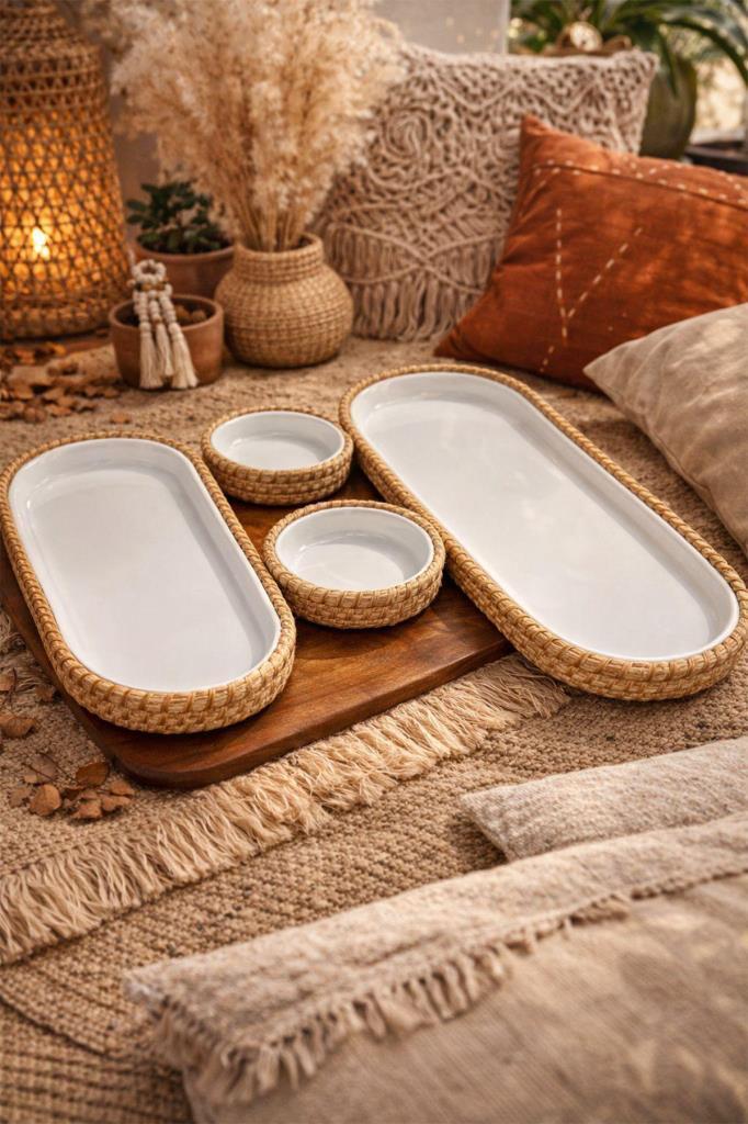 Sofralarınıza hem rustik bir hava hem de modern bir şıklık katacak 4 parça melamin sunum seti, jüt kaplama detayı ile doğal ve estetik bir görünüm sunar.