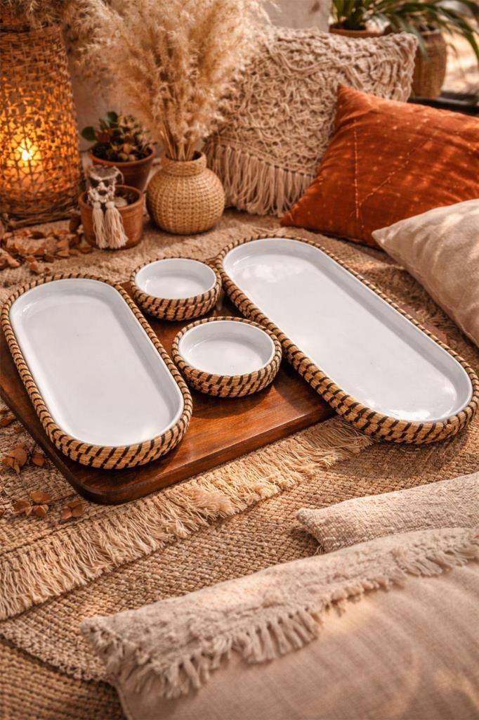 Sofralarınıza hem rustik bir hava hem de modern bir şıklık katacak 4 parça melamin sunum seti, jüt kaplama detayı ile doğal ve estetik bir görünüm sunar.
