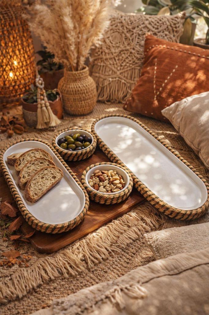 Sofralarınıza hem rustik bir hava hem de modern bir şıklık katacak 4 parça melamin sunum seti, jüt kaplama detayı ile doğal ve estetik bir görünüm sunar.