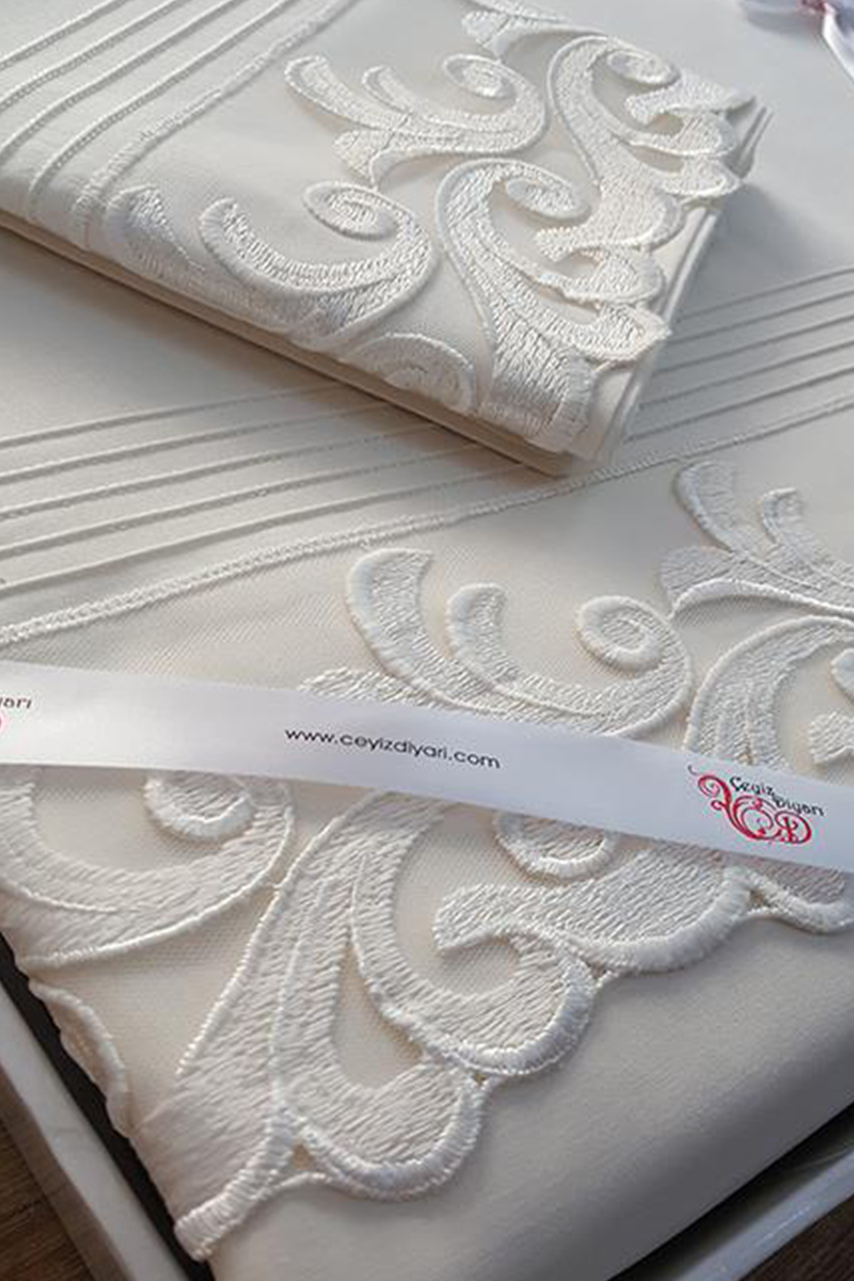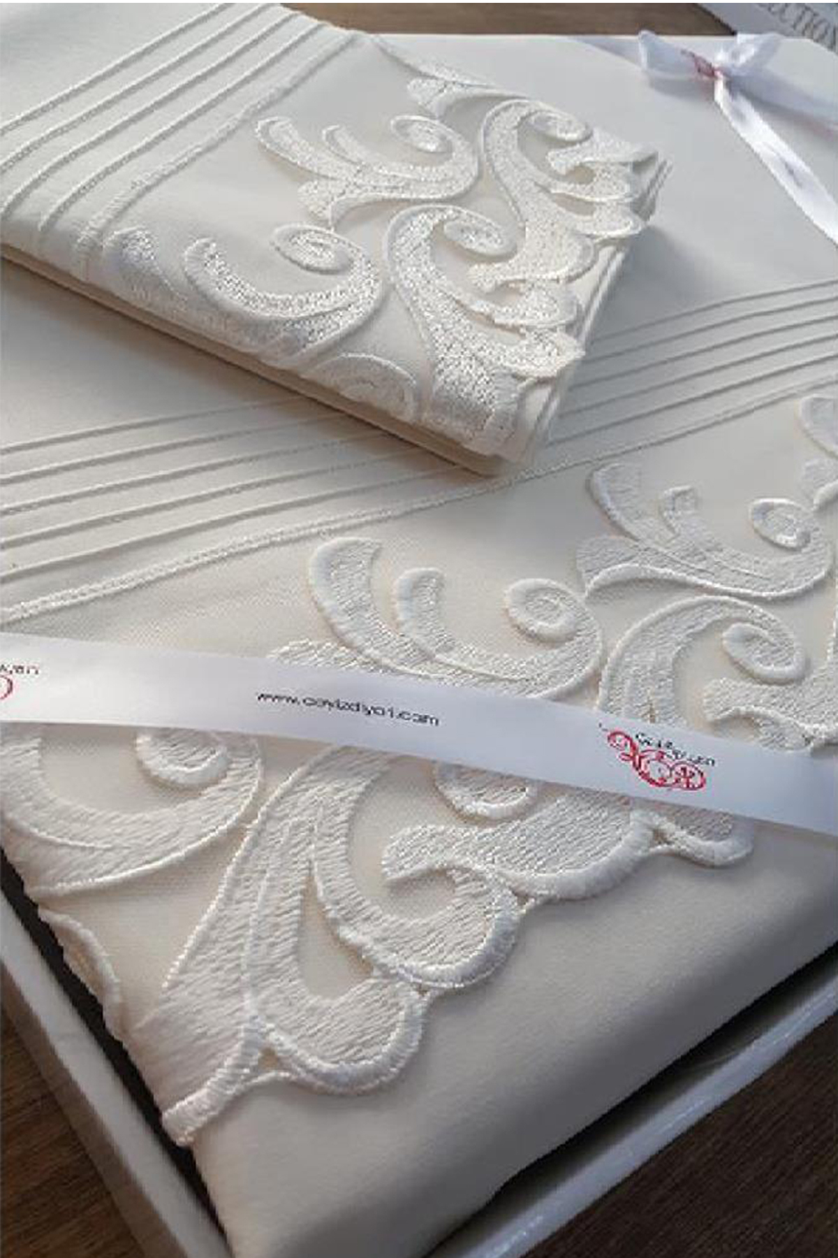 Pamuk Kumaştan üretilmiştir. Nevresim ağzına nervür çalışması gerçekleştirilerek fransız güpürü dikilmiş özelbir tasarım oluşturulmuştur.