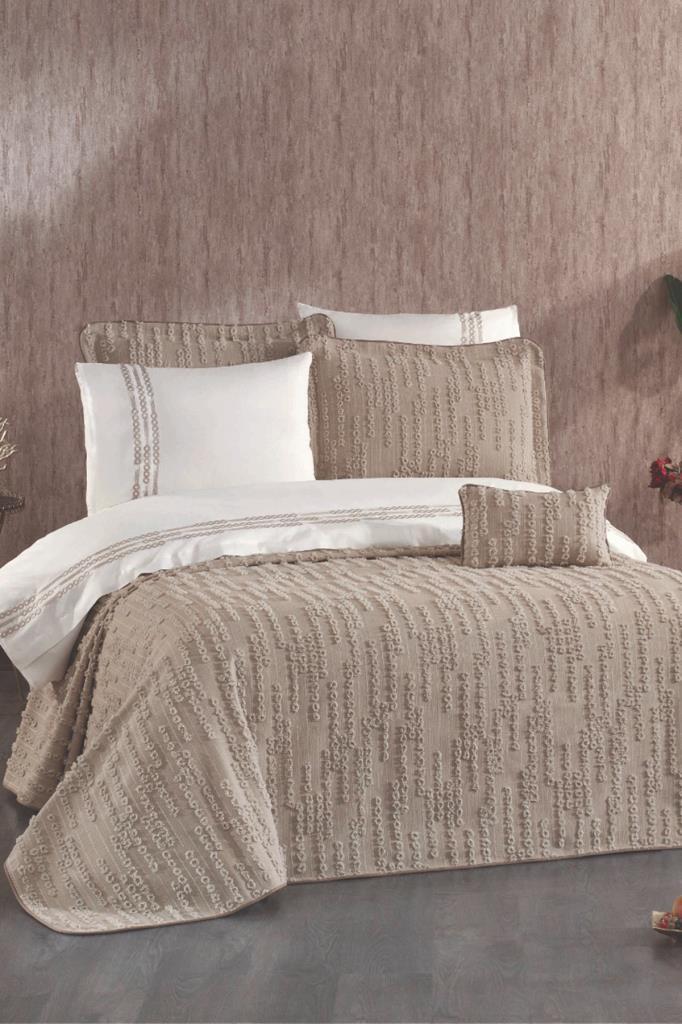 Nevresim takımı Akfil kumaştan üretilmiştir. Pike ve Pike kırlent kılıfları Şönil Kumaştan üretilmiştir.