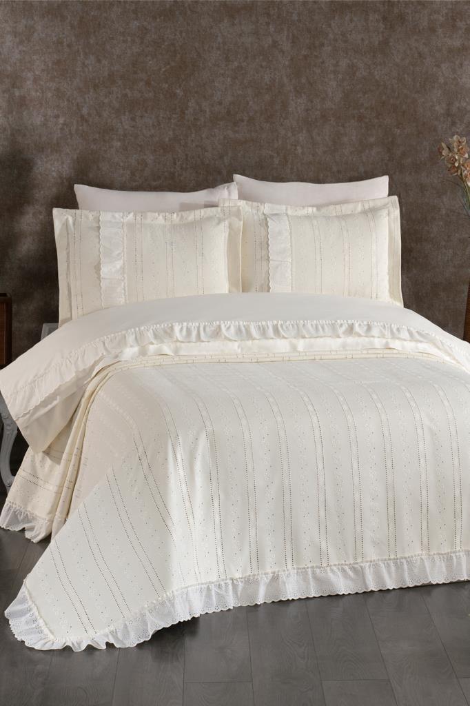 Nevresim takımı Akfil kumaştan üretilmiştir. Pike ve Pike kırlent kılıfları Şönil Kumaştan üretilmiştir.