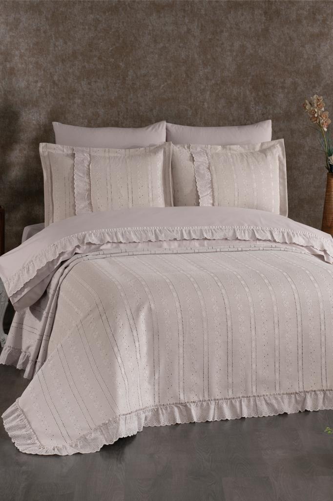 Nevresim takımı Akfil kumaştan üretilmiştir. Pike ve Pike kırlent kılıfları Şönil Kumaştan üretilmiştir.