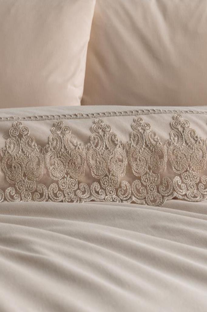 Pamuk Kumaştan üretilmiştir. Nevresim Ağızına Fransız Güpürü Dikilerek Özel Bir Tasarım Oluşturulmuştur.