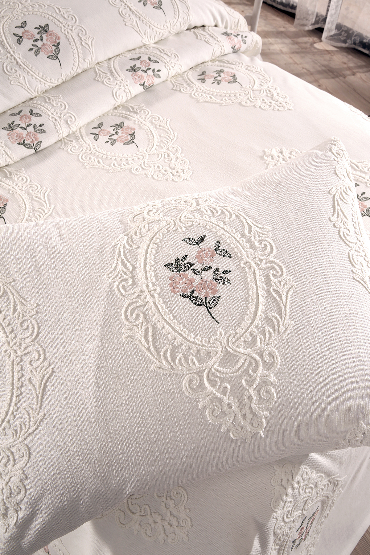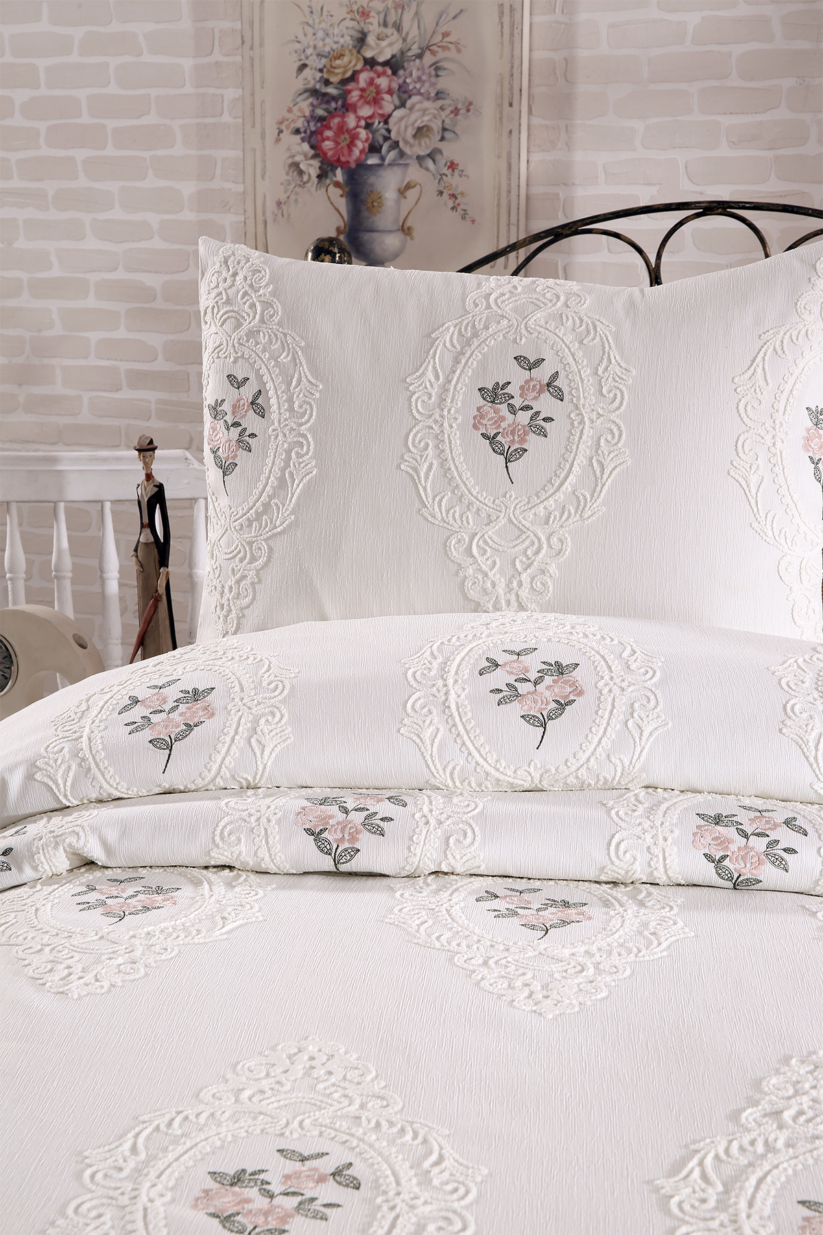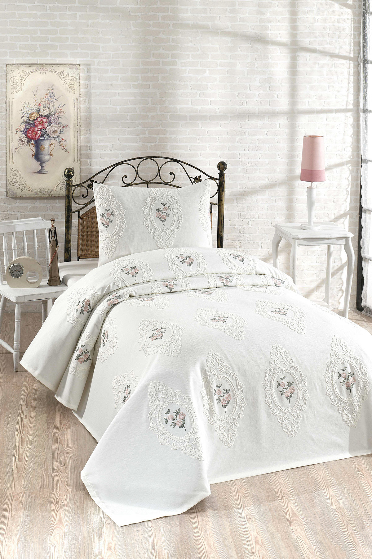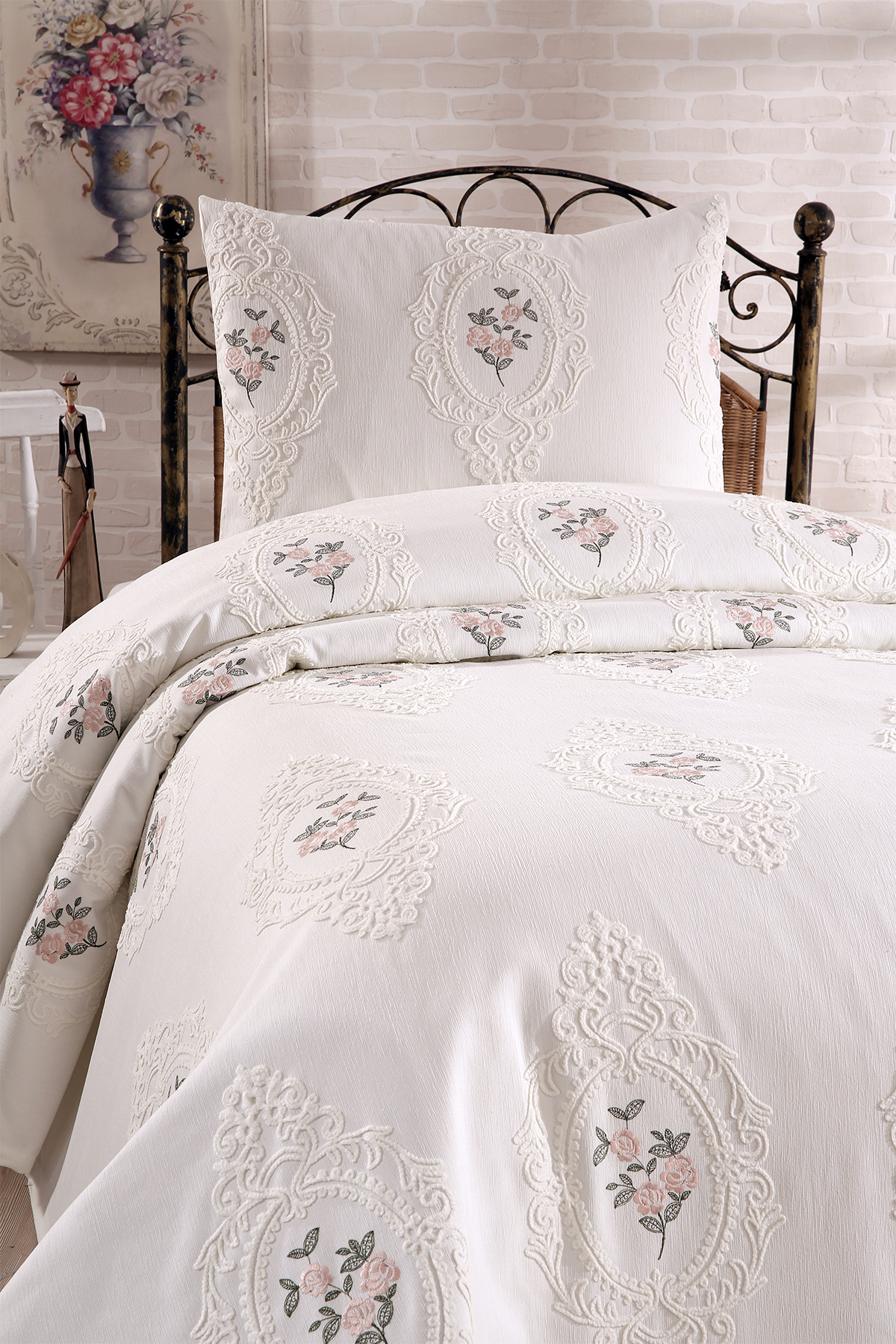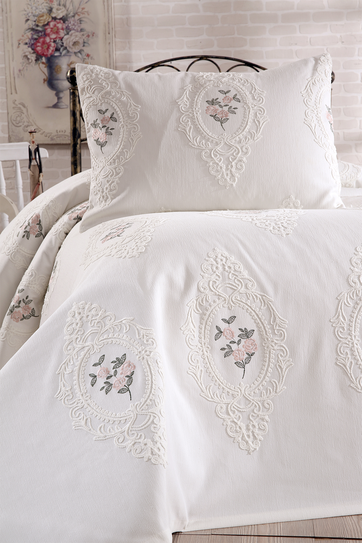 Gardenlove Nakışlı Şönil 2 Parça Tek Kişilik Yatak Örtüsü Krem