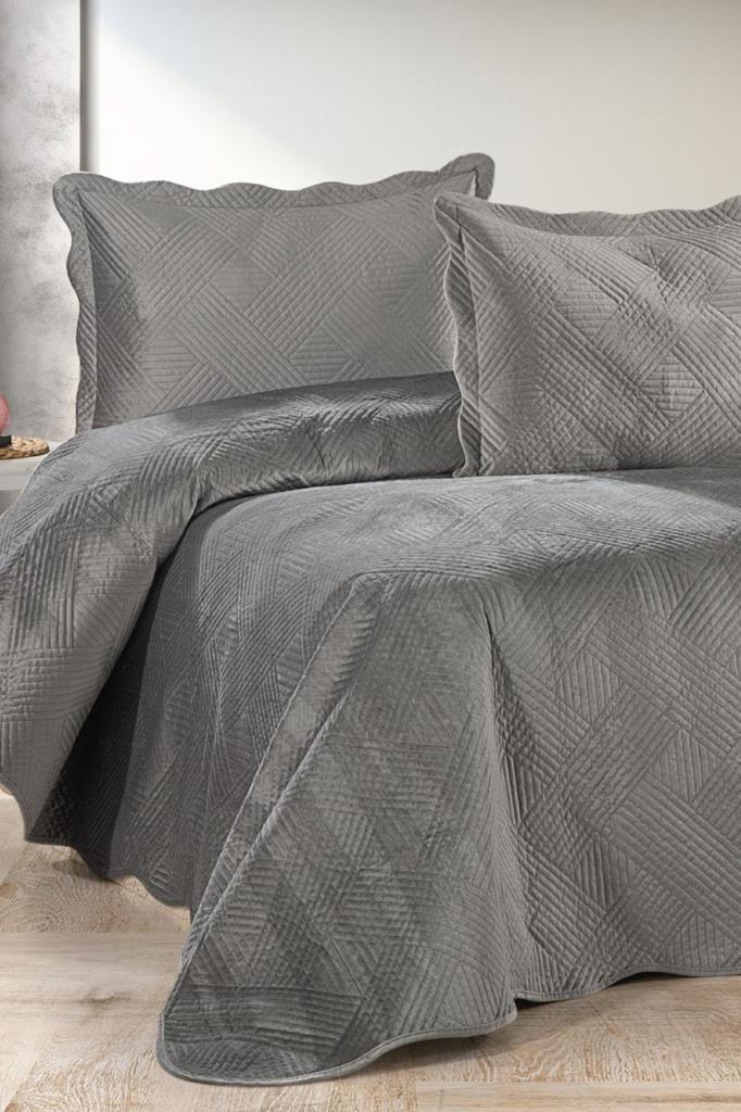 Gona Lüks Kadife Çift Kişilik Yatak Örtüsü Gri