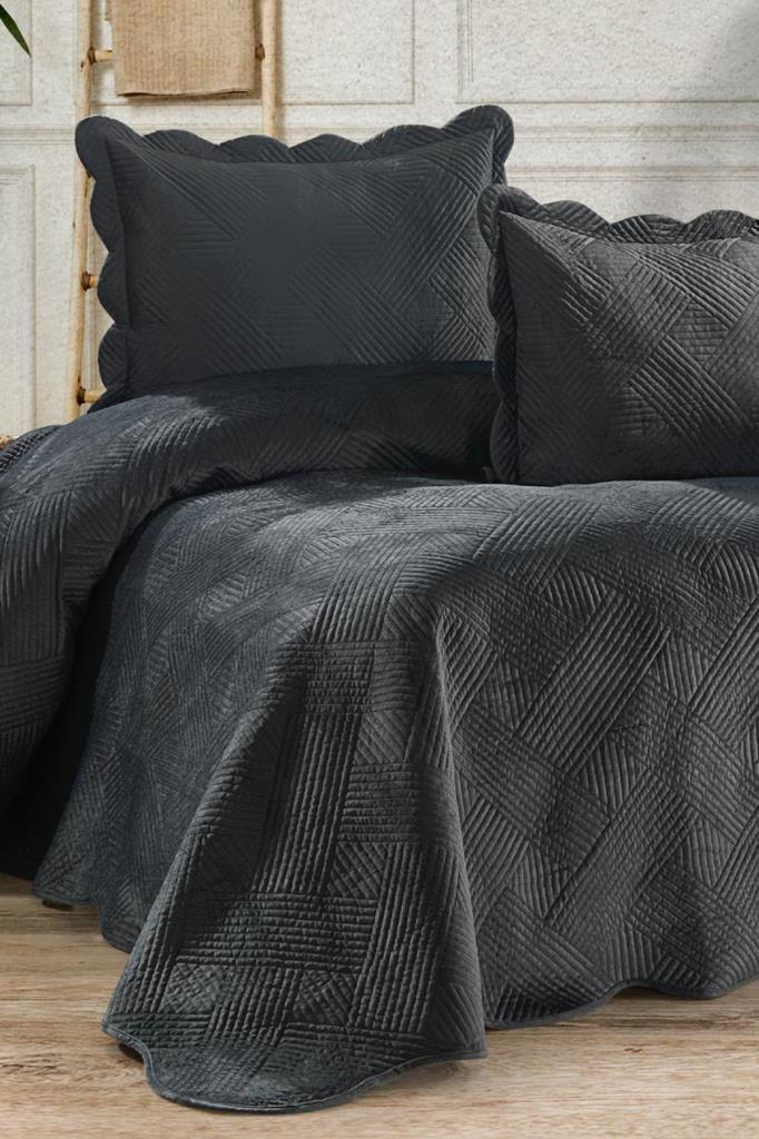 Gona Lüks Kadife Çift Kişilik Yatak Örtüsü Koyu Gri