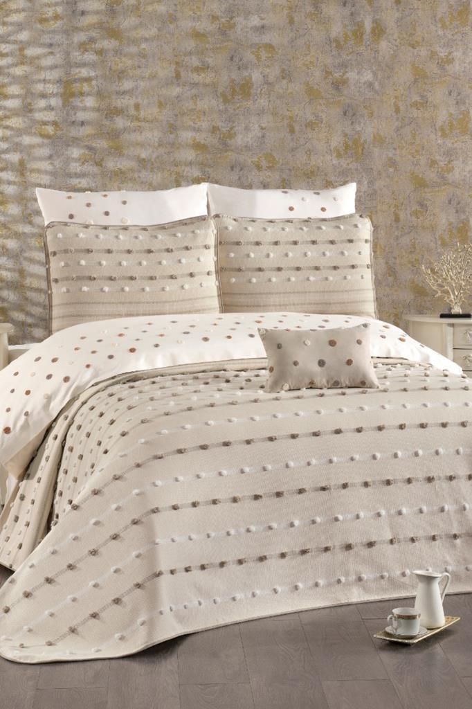 Nevresim takımı Akfil kumaştan üretilmiştir. Pike ve Pike kırlent kılıfları Şönil Kumaştan üretilmiştir.
