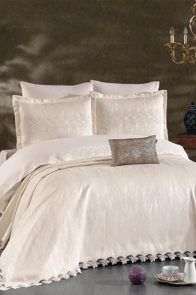 Nevresim takımı Akfil kumaştan üretilmiştir. Pike ve Pike kırlent kılıfları Şönil Kumaştan üretilmiştir.