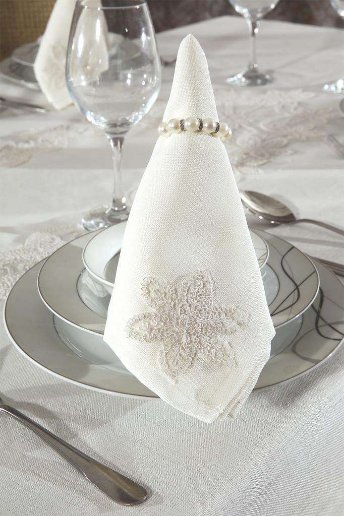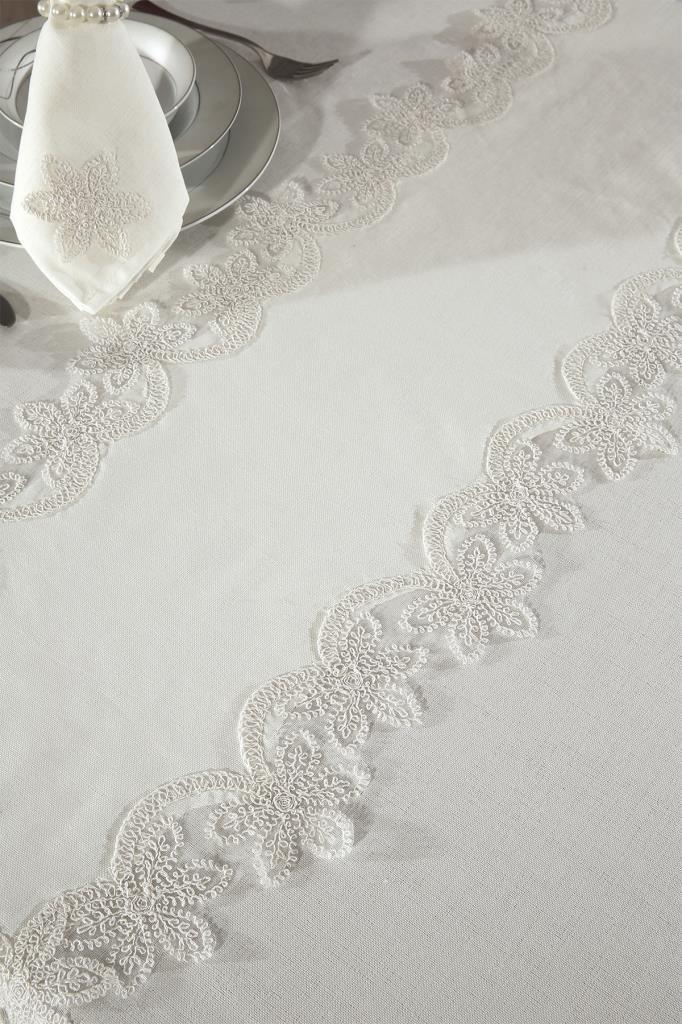 Masa Örtüsünün Dört Çevresi ve Runner uçları Fransız Taşlı Güpürleri ile süslenerek özel bir tasarım oluşturulmuştur.