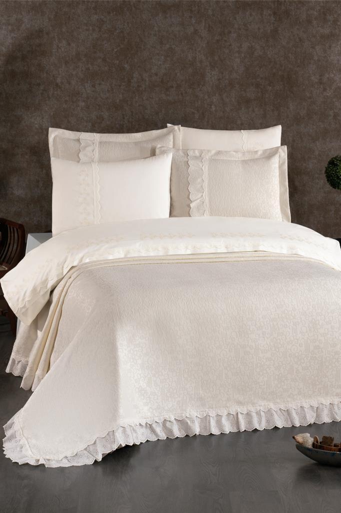 Nevresim takımı Akfil kumaştan üretilmiştir. Pike ve Pike kırlent kılıfları Şönil Kumaştan üretilmiştir.