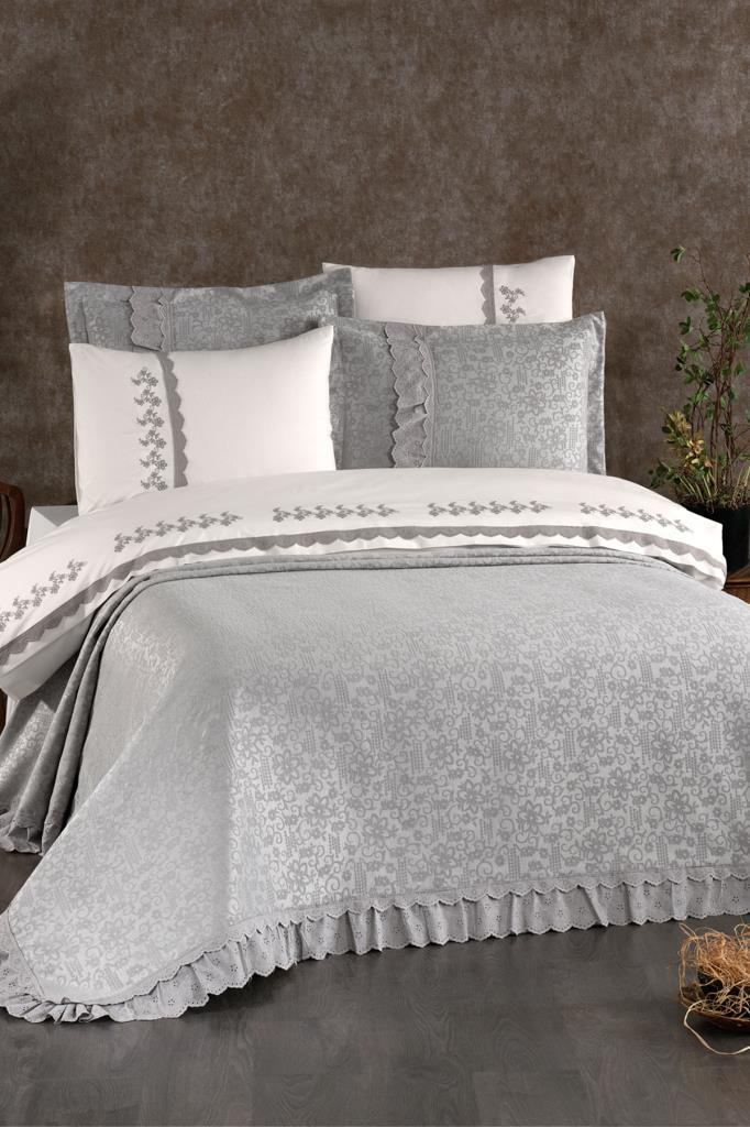 Nevresim takımı Akfil kumaştan üretilmiştir. Pike ve Pike kırlent kılıfları Şönil Kumaştan üretilmiştir.