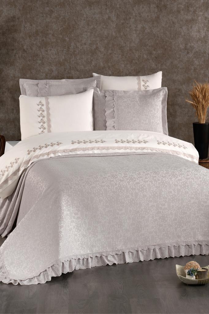 Nevresim takımı Akfil kumaştan üretilmiştir. Pike ve Pike kırlent kılıfları Şönil Kumaştan üretilmiştir.