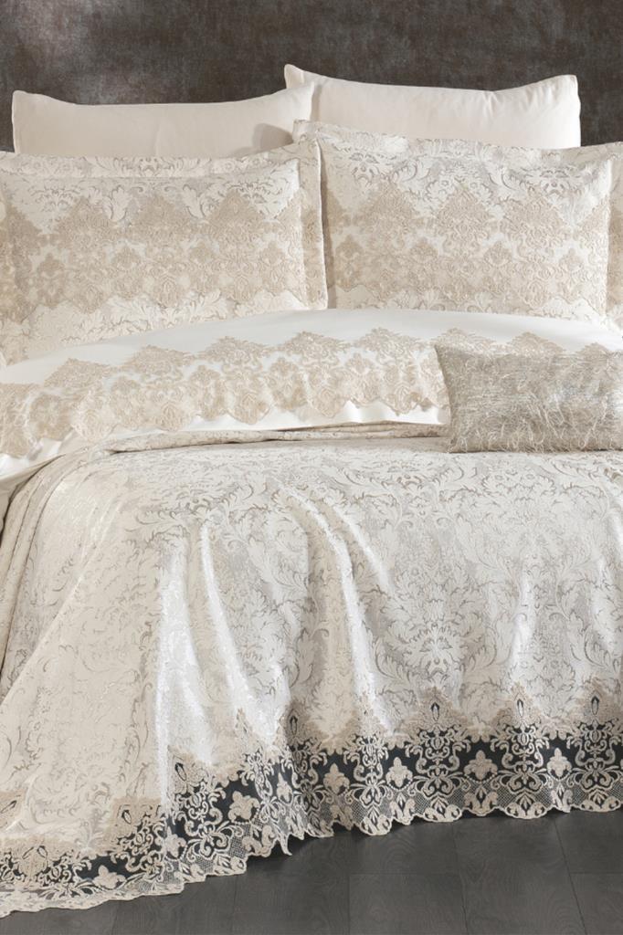 Nevresim takımı Akfil kumaştan üretilmiştir. Pike ve Pike kırlent kılıfları Şönil Kumaştan üretilmiştir.
