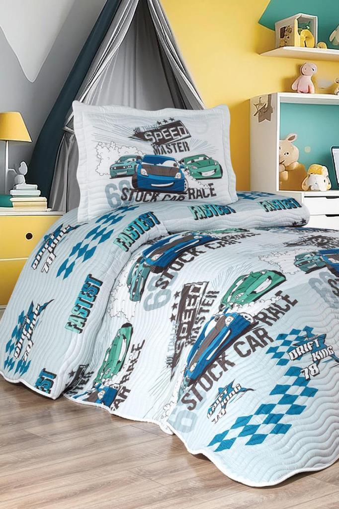 Oto Show Baskılı Kapitoneli Tek Kişilik Yatak Örtüsü Mavi