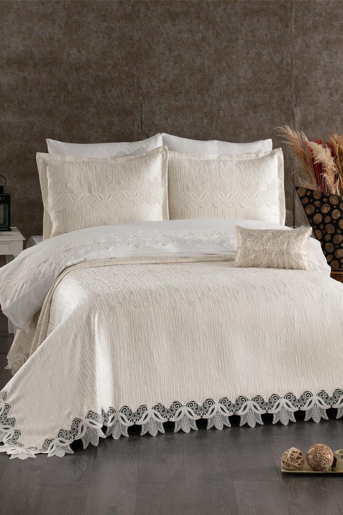 Nevresim takımı Akfil kumaştan üretilmiştir. Pike ve Pike kırlent kılıfları Şönil Kumaştan üretilmiştir.
