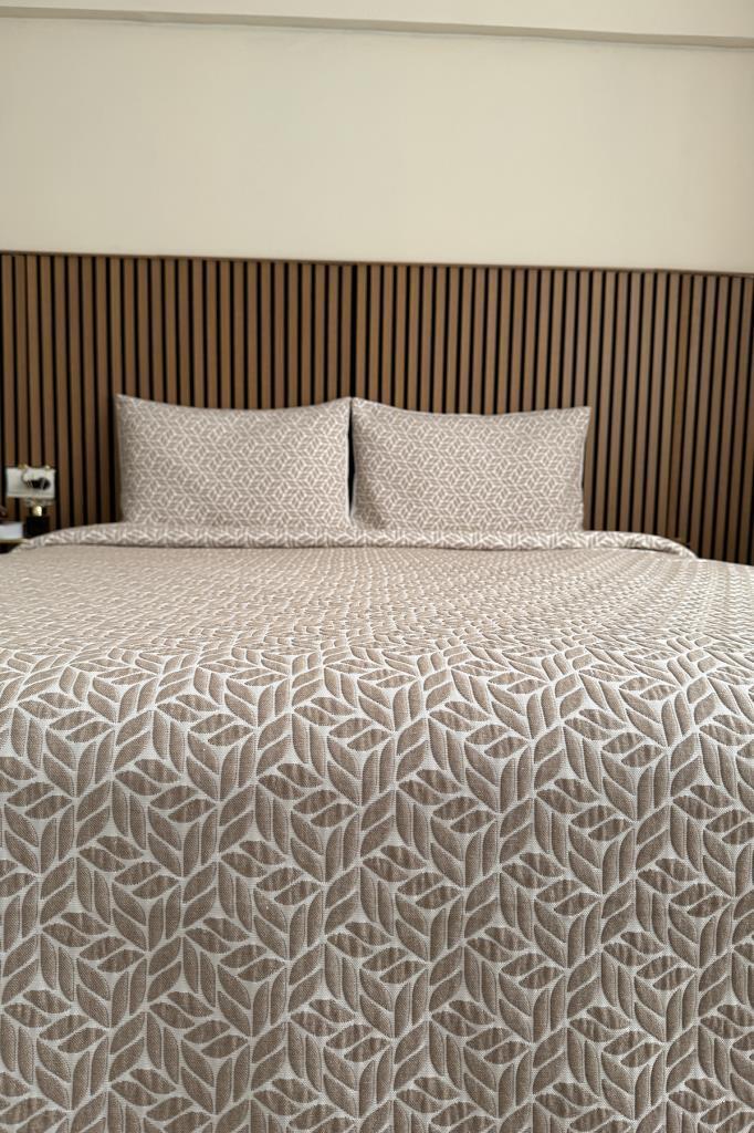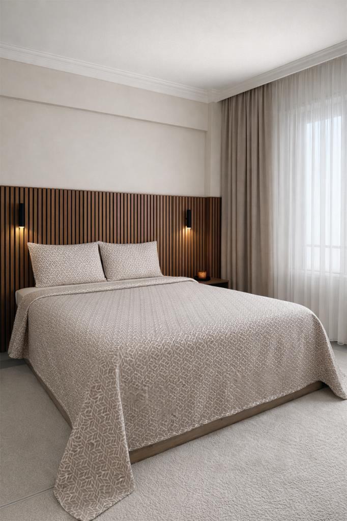 Günlük kullanımın yanı sıra çeyizlik olarak da tercih edilebilecek bu yatak örtüsü, sade ve şık tasarımıyla farklı yatak odası dekorasyonlarına kolayca uyum sağlar.