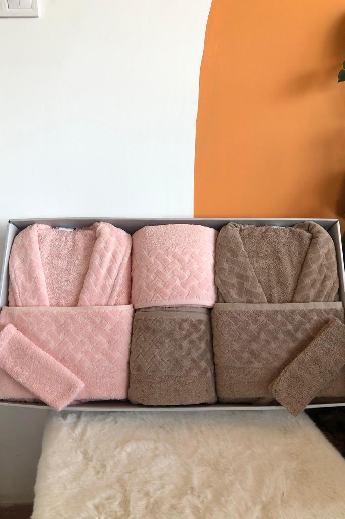 Set, iki adet lüks bornoz, iki adet yumuşak banyo havlusu ve iki adet baş havlusundan oluşmaktadır.