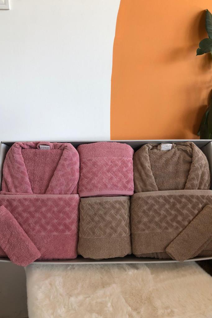 Set, iki adet lüks bornoz, iki adet yumuşak banyo havlusu ve iki adet baş havlusundan oluşmaktadır.