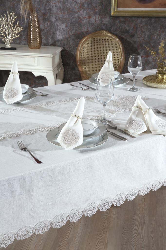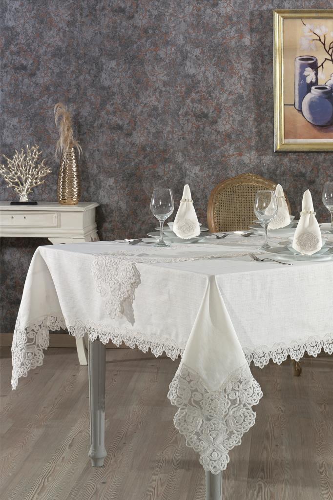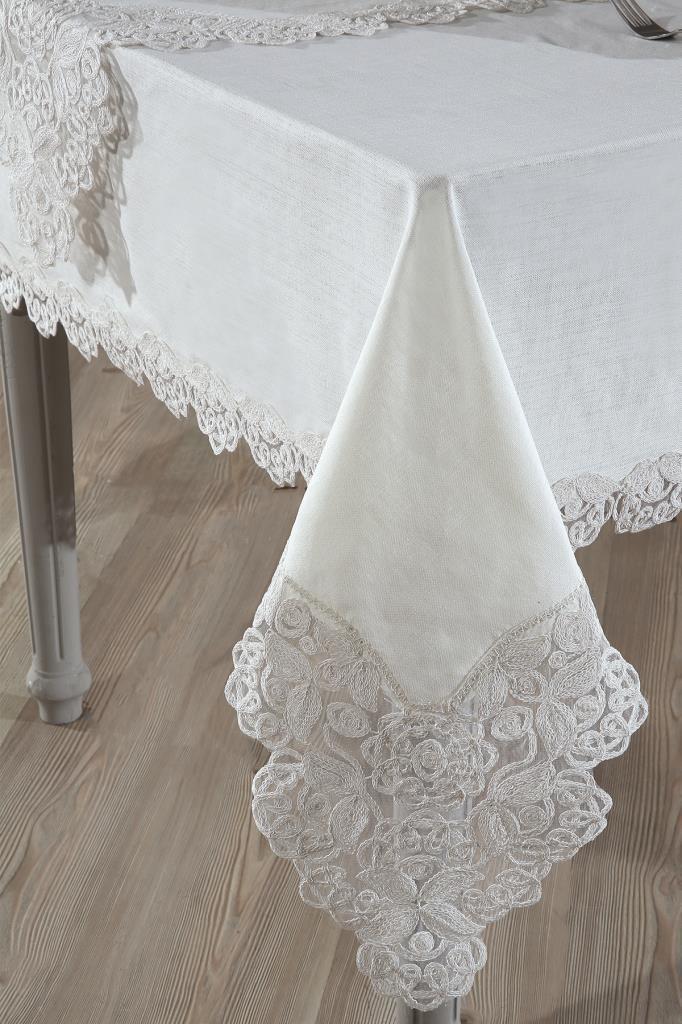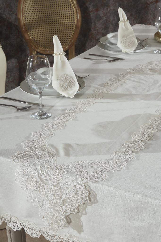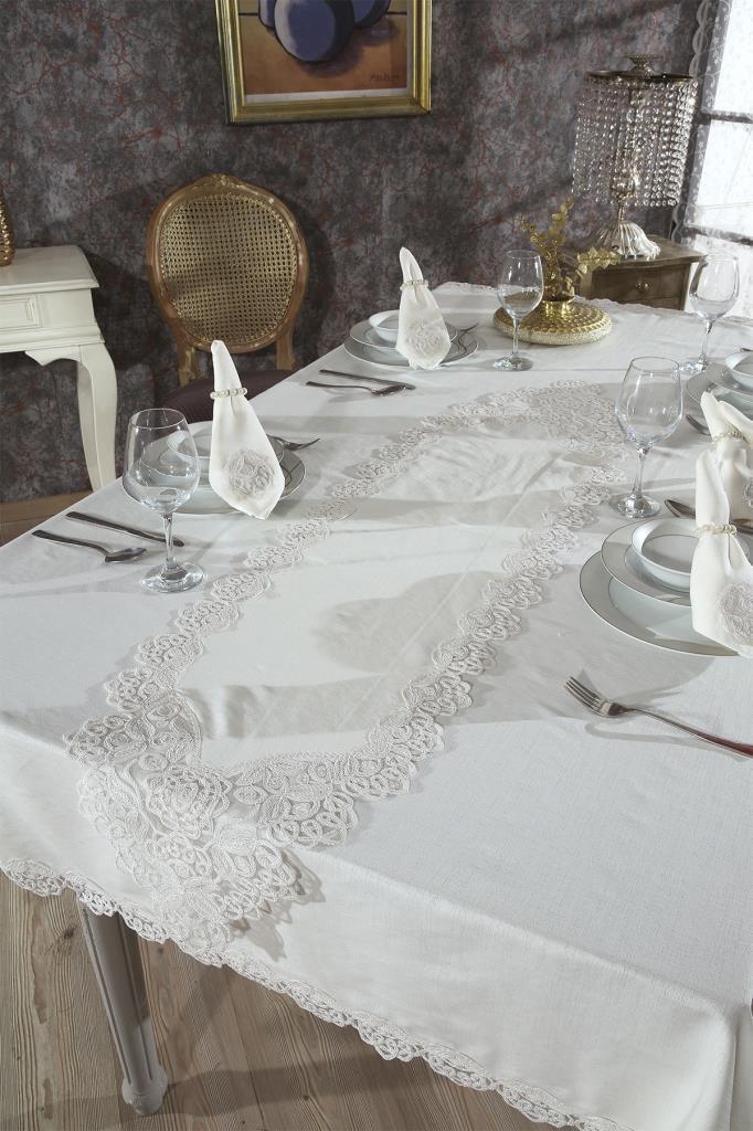 Masa Örtüsünün Dört Çevresi ve Runner uçları Fransız Taşlı Güpürleri ile süslenerek özel bir tasarım oluşturulmuştur.
