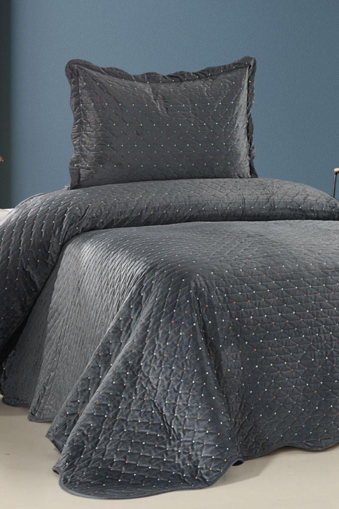 Serelina Lüks Nakışlı Kadife Tek Kişilik Yatak Örtüsü Koyu Gri