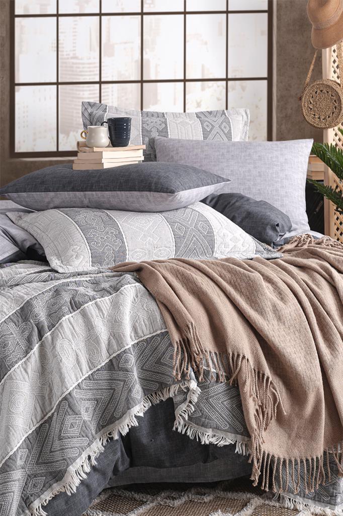 Nevresim takımı Akfil kumaştan üretilmiştir. Pike ve Pike kırlent kılıfları Şönil Kumaştan üretilmiştir.