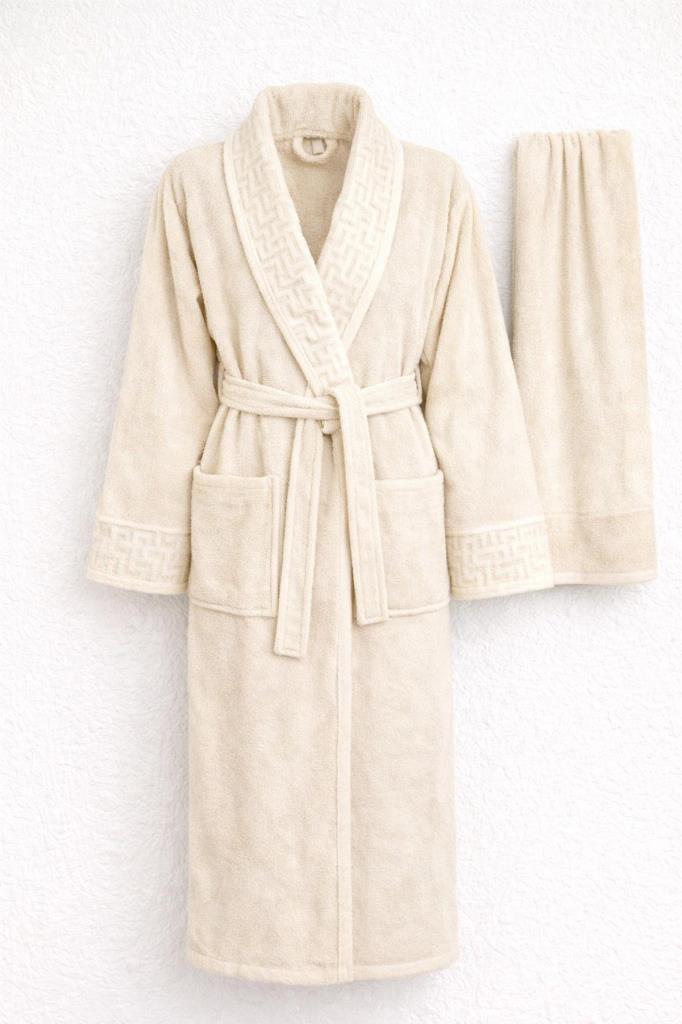 Hem ev kullanımı hem de çeyizler için ideal olan bu şık bornoz takımı, sade ve zamansız tasarımıyla banyonuza zarif bir dokunuş katar.