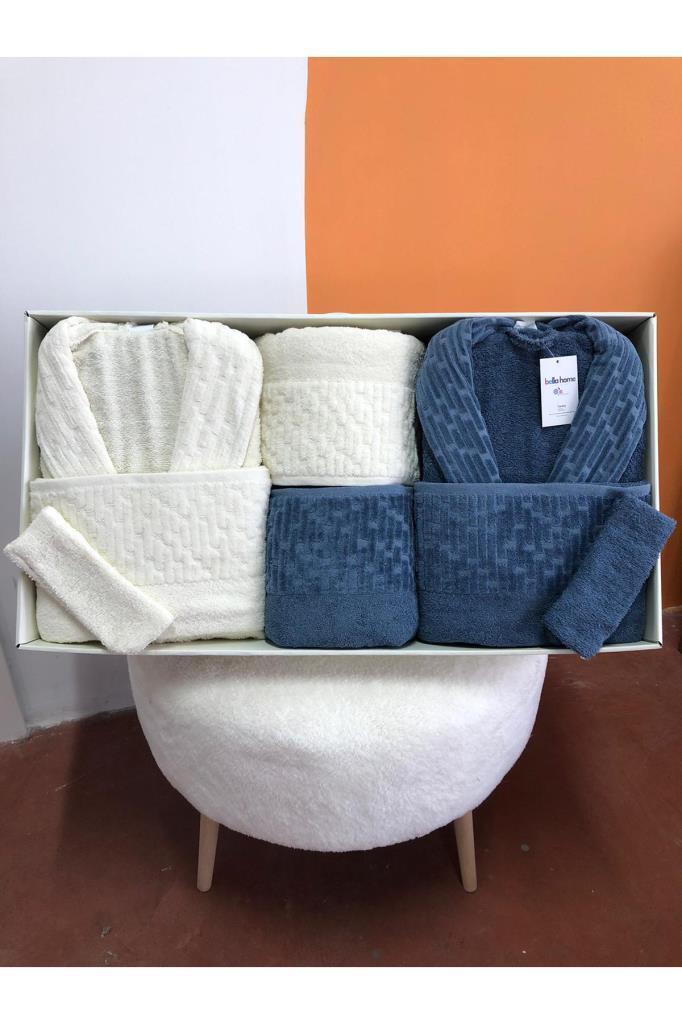 Su Yolu 8 Parça Aile Bornoz Takımı Krem - İndigo