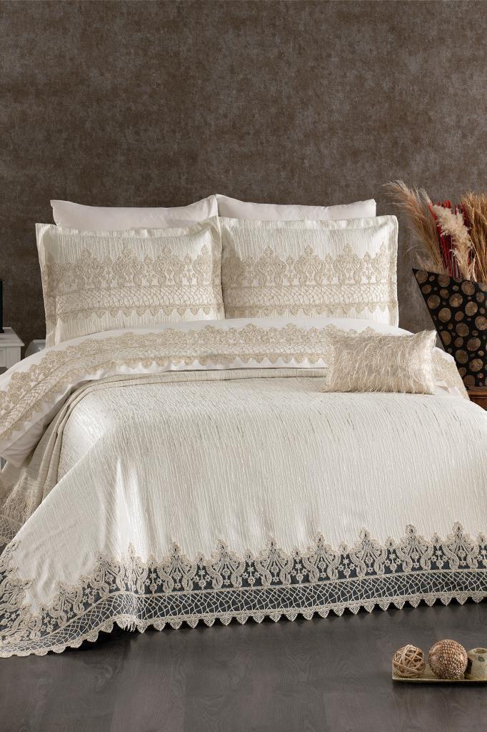 Nevresim takımı Akfil kumaştan üretilmiştir. Pike ve Pike kırlent kılıfları Şönil Kumaştan üretilmiştir.