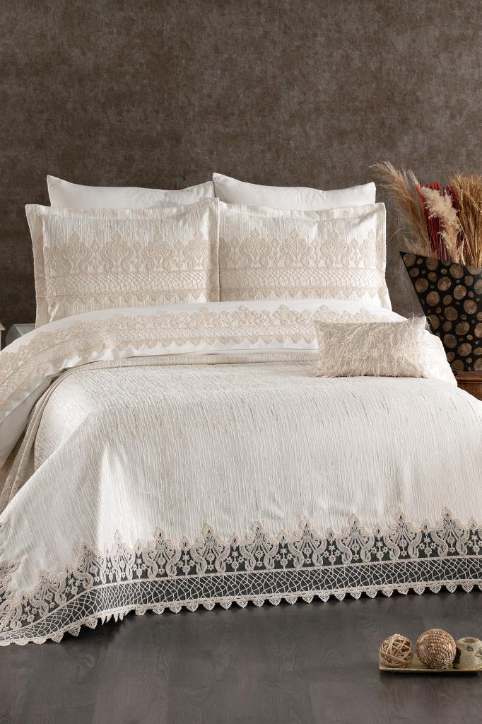 Nevresim takımı Akfil kumaştan üretilmiştir. Pike ve Pike kırlent kılıfları Şönil Kumaştan üretilmiştir.