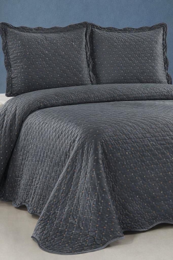Velura Lüks Nakışlı Kadife Çift Kişilik Yatak Örtüsü Koyu Gri