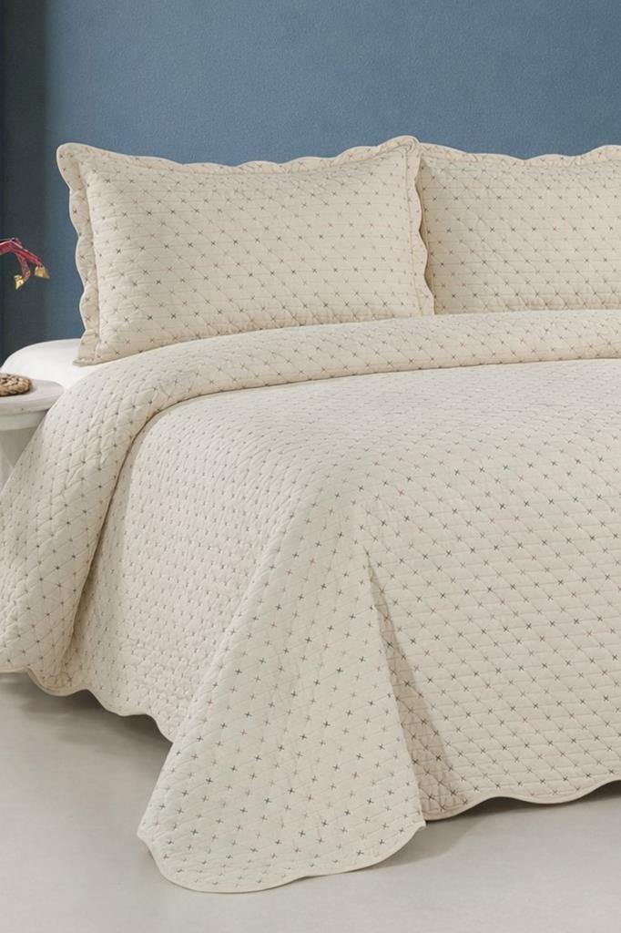 Velura Lüks Nakışlı Kadife Çift Kişilik Yatak Örtüsü Krem