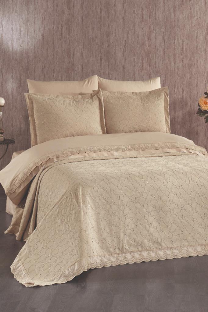Nevresim takımı Akfil kumaştan üretilmiştir. Pike ve Pike kırlent kılıfları Şönil Kumaştan üretilmiştir.