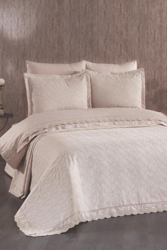 Nevresim takımı Akfil kumaştan üretilmiştir. Pike ve Pike kırlent kılıfları Şönil Kumaştan üretilmiştir.