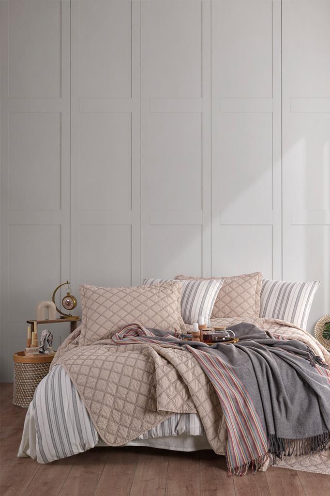 Nevresim takımı Akfil kumaştan üretilmiştir. Pike ve Pike kırlent kılıfları Şönil Kumaştan üretilmiştir.