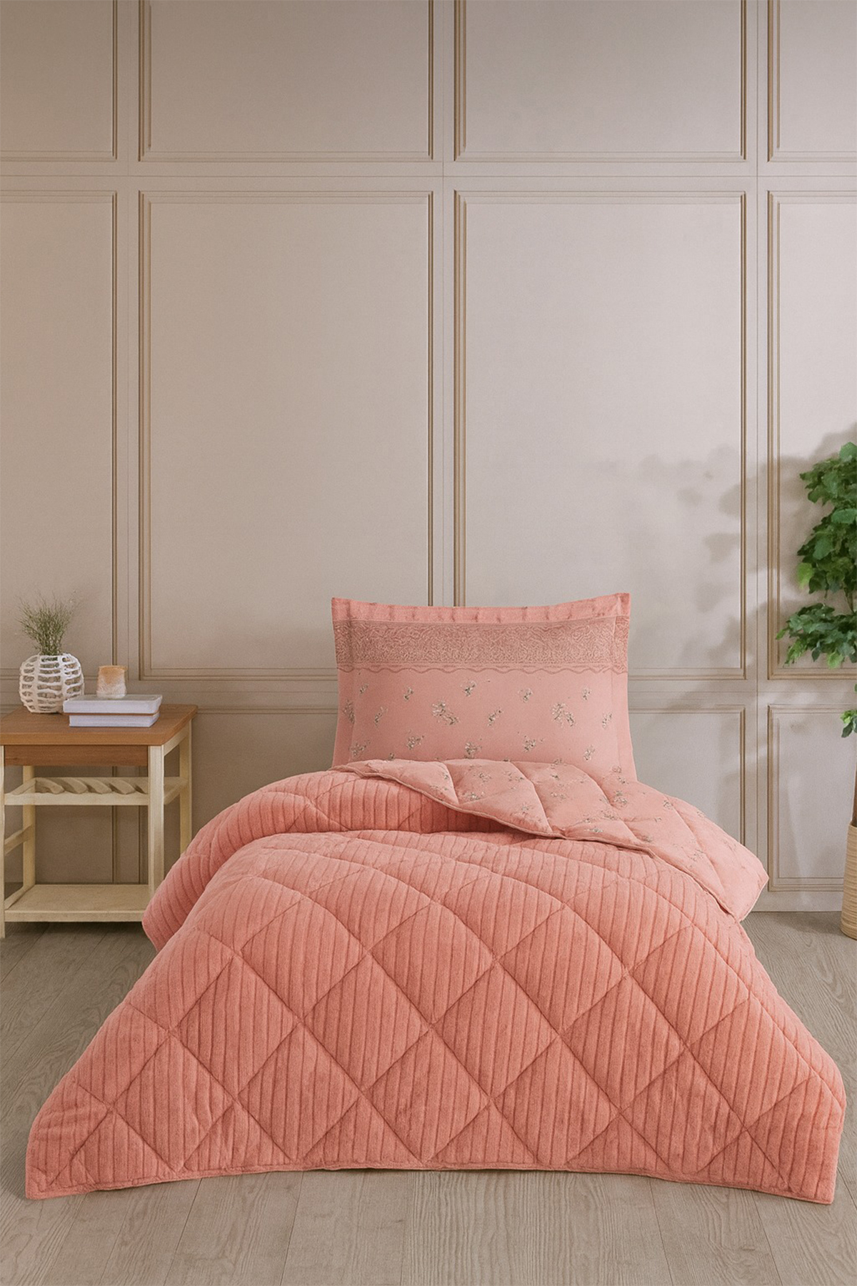 Wellsoft Jakarlı Uyku Seti 3 Parça Tek Kişilik Pudra