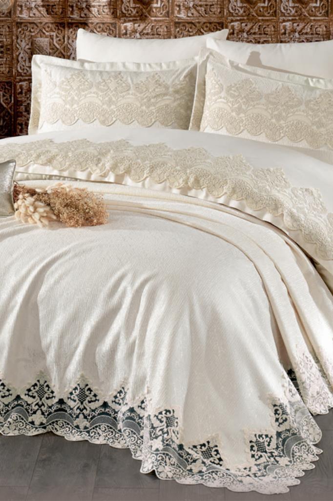 Nevresim takımı Akfil kumaştan üretilmiştir. Pike ve Pike kırlent kılıfları Şönil Kumaştan üretilmiştir.
